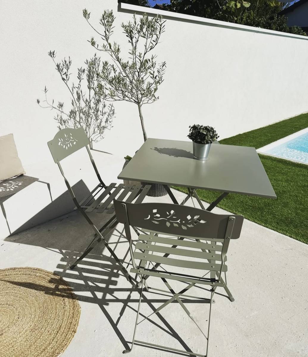 La rénovation d’un salon de jardin métallique passe par plusieurs étapes clés. Le sablage permet d’éliminer rouille, peinture écaillée et impuretés, préparant ainsi le support à recevoir un nouveau revêtement. Le thermolaquage, ici appliqué en teinte RAL 7003 (gris mousse) avec une finition fine texture, assure une protection optimale contre les intempéries tout en apportant un rendu moderne et homogène.