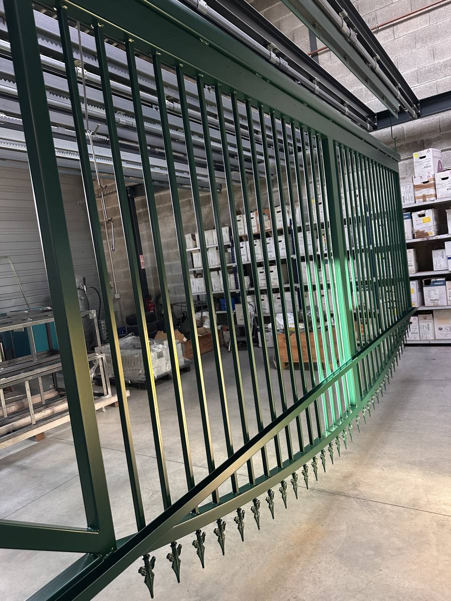 Un portail d’entrée mesurant 6200 mm de large pour 2300 mm de haut a été entièrement thermolaqué en teinte RAL 6005 mat pour une résidence située près de Lyon, dans le Rhône. Cette finition vert mousse offre à la fois sobriété, intégration paysagère et protection durable.