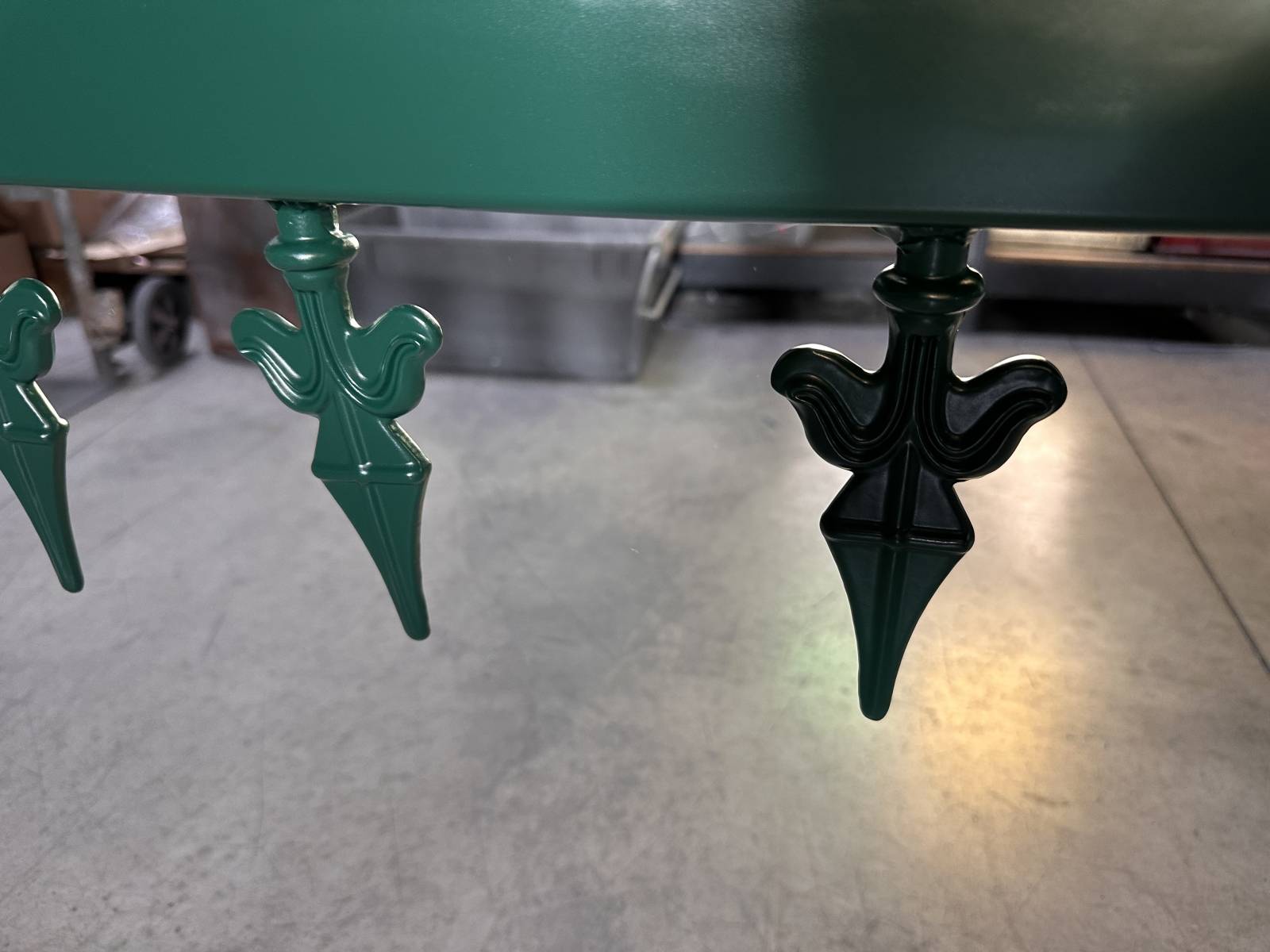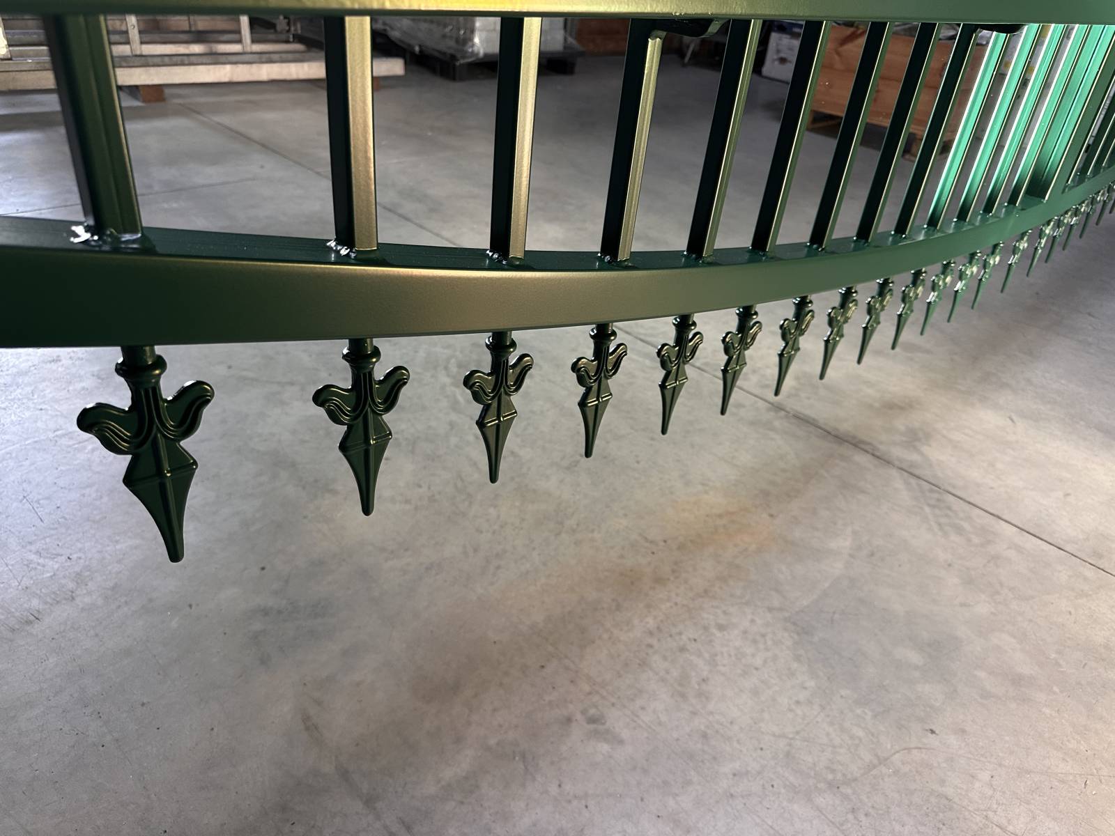 La teinte RAL 6005 mat a été choisie pour son élégance discrète et sa capacité à se fondre dans l’environnement végétalisé des résidences. Le thermolaquage a été réalisé en cabine avec cuisson à haute température, garantissant une excellente tenue aux intempéries et aux UV, même sur des structures de grande taille.